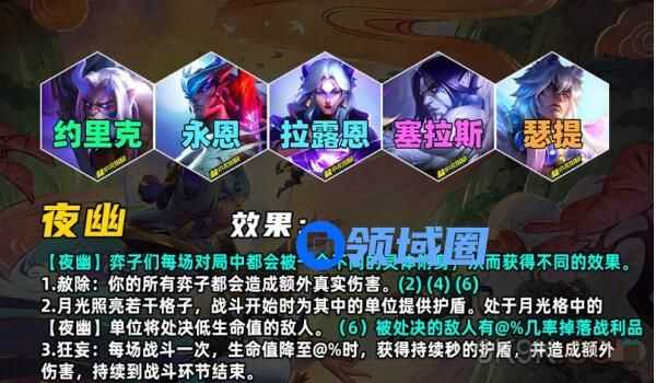 月光照亮若干格子:战斗开始时为其中的单位提供护盾。处于月光格中的【夜幽】单位将处决低生命值的敌人。