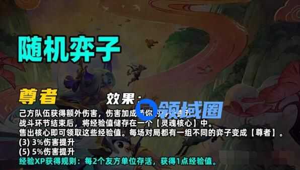 己方队伍获得额外伤害,伤害加成随你的等级提升,战斗环节结束后,将经验值储存在一个【灵魂核心】中,售出核心即可领取这些经验值。每场对局都有一组不同的弈子变成【尊者】