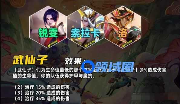 你的队伍获得护甲与魔抗。【武仙子】会根据造成伤害值的百分比对生命值最低的那个友军治疗