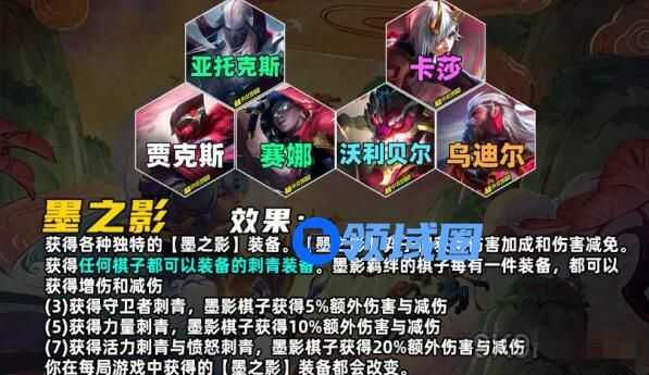 获得任何棋子都可以装备的刺青装备。墨影羁绊的棋子每有一件装备,都可以获得增伤和减伤