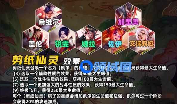 每个剪纸仙灵弈子的星级会增加天使的生命值和法强,并且每过一个阶段天使会获得20%的攻速加成