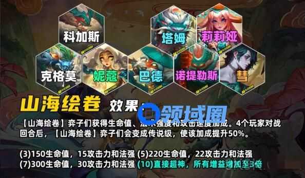 和S4的羁绊名称一样,但是效果不同,山海绘卷的弈子会获得生命值、攻击力和法强,经过4场战斗后,山海绘卷】弈子们会变成传说级,增益效果提升50%,实战中脚下有个和S4三国羁绊一样的圈