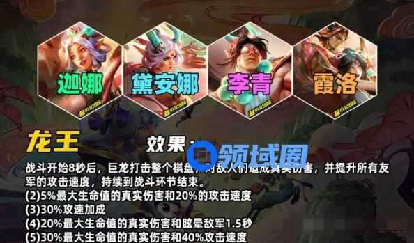 战斗开始8秒后,龙会击打所有敌军,造成真实伤害并给所有友军攻速加成,持续到回合结束。和S7的风暴龙羁绊类似