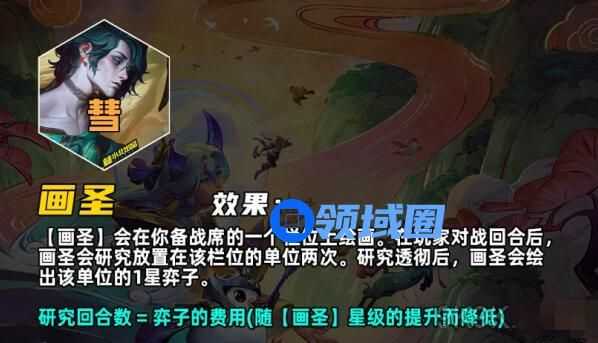 画圣会在在备战席上绘画出一个格子,在玩家对战回合后,【画圣】会研究备战席上格子的单位两次。研究透彻后,【画圣】会绘出该单位的1星弈子。研究回合数=弈子的费用(随【画圣】星级的提升而降低)