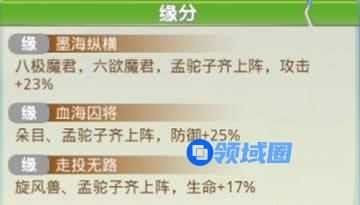 孟驼子的缘分推荐和朵目齐上阵加防御的组合,既然是要采取消耗的战术,那么增加生存能力必不可少,这套组合的获取难度都不高,在前期可以非常轻松的过渡。