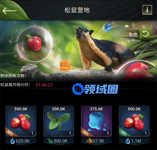 松鼠营地每升一级,都可减少30分钟的到访间隔,提升可交易商品的种类与质量。在新手期,建议领主大人把松鼠营地升级到17级,保证每日松鼠可到访3次。