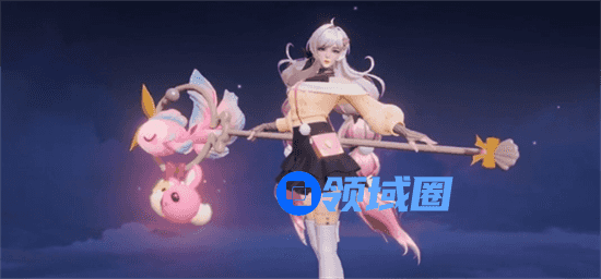 发型设计上,粉色系渐变长发上别着粉色爱心发箍,时尚可爱;服装设计上,米白色简洁上衣,搭配俏皮黑色短裙;配饰设计上,粉色斜挎小包、神秘手杖、可爱小兔子玩偶等元素,使整个角色形象更加甜美和梦幻;武器创意方面化为精美的手杖,手杖顶部装饰类似鱼形设计,上面挂着两只可爱的玩偶,手杖周身闪耀着高贵且梦幻的光泽~