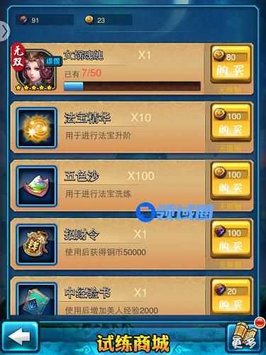 试炼商店:如果说试练塔65层太遥远,灵元商店刷女娲太虚无,那么试炼商店就能让你感受到无双女娲近在眼前,使用试炼精魄就能购买到女娲魂魄。不但如此,这里还有法宝进阶所需的法宝精华、洗练所需的五色沙、美人升级所需的经验书、换取铜钱需要的招财令等商城道具,绝对货真价实童叟无欺,重点是购买无上限哦!