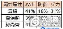 作为中排武将,注重攻击的同时对于生存能力也有一定要求,在羁绊属性增益上三者相差不大,孙尚香在攻防两端略占优势,兵力增幅则略少于袁绍和夏侯渊。
