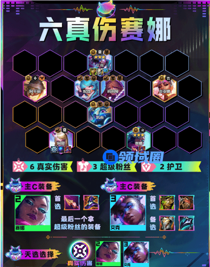 2.阵容羁绊:4/6真伤3KDA3超级粉丝2护卫2秘术