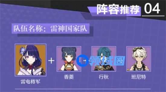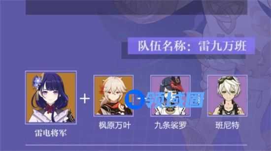 三个辅助与雷电将军主C的队伍,九条裟罗提供增伤及爆伤增加,翠绿套万叶可以提供增伤与减抗,班尼特提供治疗与攻击增加。这可以使雷电将军的元素爆发期间打出爆炸伤害。