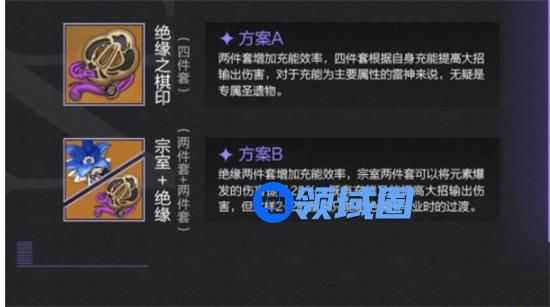 绝缘两件套增加充能效率,宗室两件套可以将元素爆发的伤害提升20%,既有充能又能提高大招输出伤害,但这样2+2的配装只能是绝缘未毕业时的过渡。