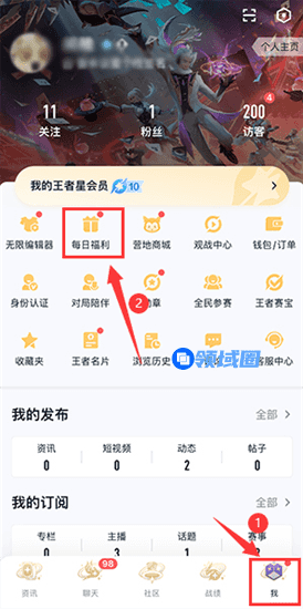 1、首先,玩家需要下载王者营APP,然后进入王者营APP,点击下面的[我],然后点击上面的[日常福利]。