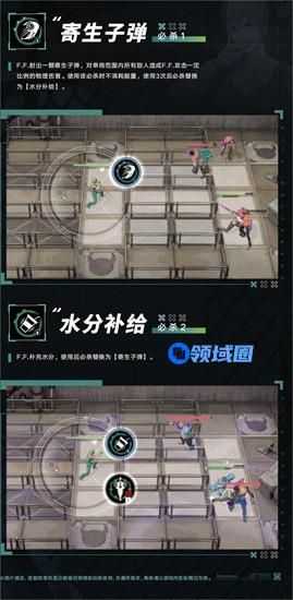 F.F,射出一颗寄生子弹,对单格范围内所有敌人造成F.F.攻击一定比例的物理伤害。使用该必杀时不消耗能量,使用3次后必杀替换为【水分补给】。