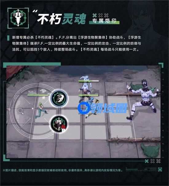 F.F.分离出【浮游生物聚集体】协助战斗,【浮游生物聚集体】继承F.F,一定比例的最大生命值,一定比例的攻击、一定比例的防御与法抗,可以阻挡1个敌人,持续整场战斗。【不朽灵魂】每场战斗只能使用一次。