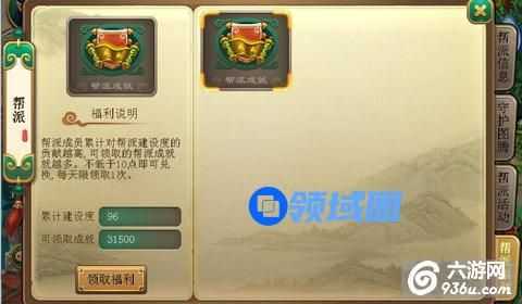 领取帮派福利:获得建设度之后,每日可领取1次帮派福利。每10点建设度等于3500点帮派成就点。