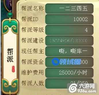 4、维护费用:帮派每小时会扣除一定的费用作为帮派维护,如果维护费不足,帮派建设度会随之下降,帮派建设度不足将会直接影响本帮派等级。