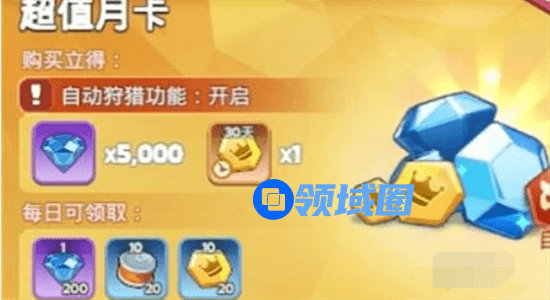 4、月卡:售价68元,购买后解锁自动狩猎,并且每天都能获得200个钻石、10个领主体力和20个10点统帅经验,有效期为30天。