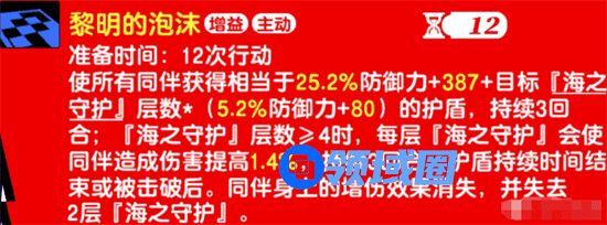 1.使所有同伴获得防御力加成+目标【海之守护】层数的护盾(防御力和技能等级越高加成越高),持续3回合。