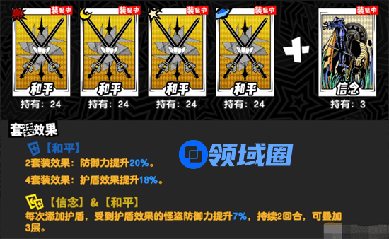 2.和平4件套+信念,每次添加护盾,受到护盾效果的怪盗提升7%的防御力,持续2回合可叠加3层,关键时刻可以起到保命作用哦~