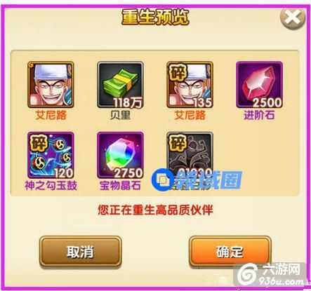 接下来看下伙伴重生可以返还的材料有哪些?同样是以+5的艾尼路为例,主要可以回收到同样的118万贝里、2500个进阶石,不过差别就在于没有海魂的奖励。