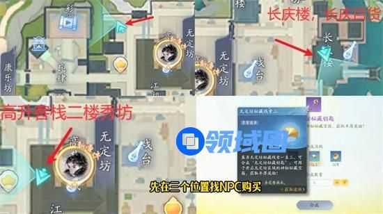 1、玩家需要前往3个位置来找到NPC购买对应的线索,随后就可以获得无定坊的钥匙。