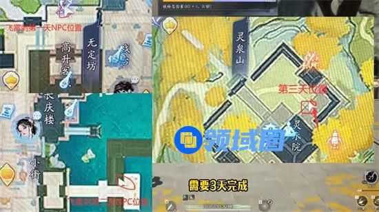需要三天完成,玩家需要按照下图所示的位置前往3个不同的未知找到飞雷刺的npc游侠对话,即可获得飞雷刺。