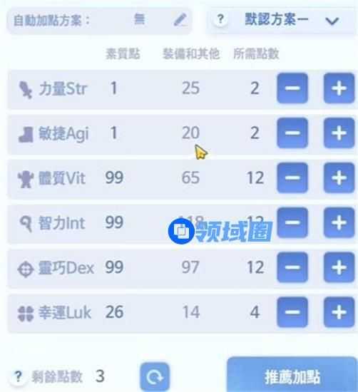 2、具体的加点,智力、灵巧、体质加满即可,多余的点数分配到幸运上。
