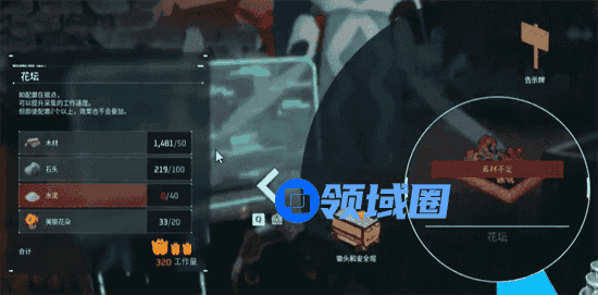 4、然后收集建造花坛所需的材料:木材50、石头100、水泥40、美丽花朵20。