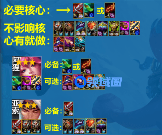 【亚索】:饮血剑、泰坦的坚决、巨龙之爪、荆棘背心、坚定之心、冕卫