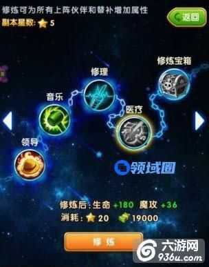 修炼系统中目前10个项目为一轮,其中9个项目可以修炼提升属性,分别对应9个伙伴的技能,再加上一个宝箱。