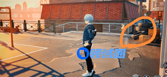 4、还是这里,火锅店后面,把时间调成夜晚,在上完楼梯后,前面有个轮胎,里面有个纪念币;