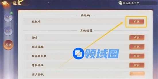 2、在系统设置界面,我们点击礼包码后方的【前往】按钮进入礼包兑换界面;