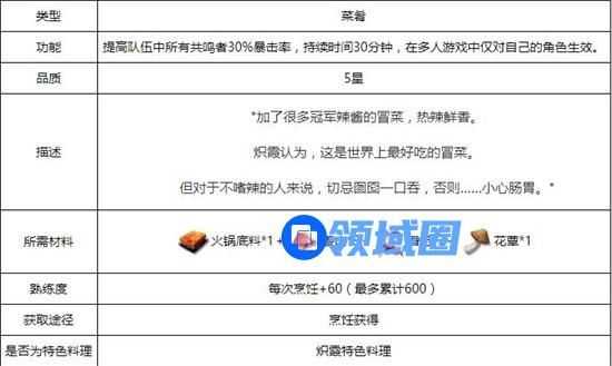 鸣潮冠军冒菜食谱配方是什么?游戏中有超多美食可以去制作,其中一个5星食谱是冠军冒菜,是炽霞特色料理,它可以提高队伍共鸣者30%暴击率,持续30分钟,只是多人游戏下仅对自己生效,很多小伙伴们还未成功做出来,其实该食谱的配方是一份火锅底料、三份兽肉、两份香苏、一份花蕈,收集这些材料就可以去制作,那么就随小编一起看下鸣潮冠军冒菜食谱配方及做法一览,下面详细介绍了食物和制作方法,感兴趣的小伙伴们一起来看看吧。,