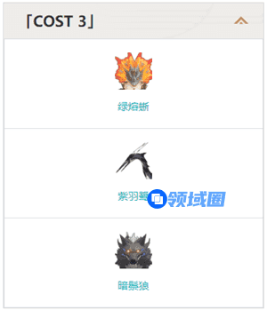 2、cost3:有三种,分别是绿熔蜥,紫羽鹭和暗棕狼。