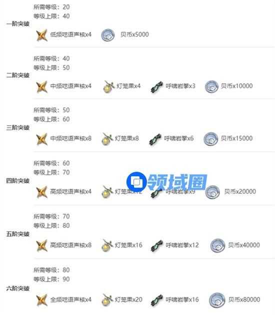 5、五阶突破:高频啸叫声核x8、灯笼果x16、呼啸岩拳x12、贝币x40000