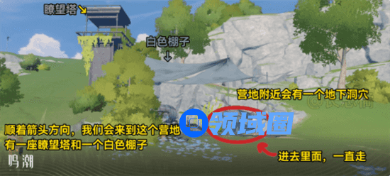1、在归墟港市中枢信标,顺着箭头,也就是北偏东一点方向,找到这个小营地,进入这个地下洞穴;