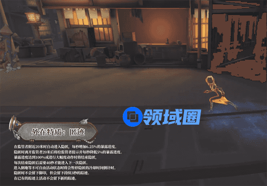 在监管者附近20米时自动进入隐匿,每秒增加6.25%的暴露进度。隐匿时离开监管者20米后将给监管者提示并每秒降低5%的暴露进度。 暴露进度达到100%或进行大幅度动作时将结束隐匿,每次结束隐匿后需要40秒才能进入下一次隐匿。 进入倒地等不可自由活动状态时将会暂停隐匿的冷却时间倒计时。 隐匿时不会留下脚印,但会留下持续3秒的踪迹。在已有的踪迹上活动不会留下新的踪迹。
