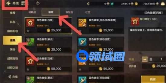 1、红色/黄色/绿色/蓝色徽章获取途径最为简单,主要以商城-徽章处以1阶25000金币的价格购买为主,消耗逐阶递增,每日有购买上限。其他获取途径:成就、礼包等。红/黄/蓝/绿色徽章系统入口如下: