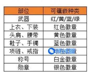 6、与DNF端游不同的是,徽章镶嵌装备后,是可以自由拆卸的,所以不要担心更换装备的问题,在继承装备强化等级且穿戴后,会自动完成徽章的继承。各部位可镶嵌徽章种类统计如下: