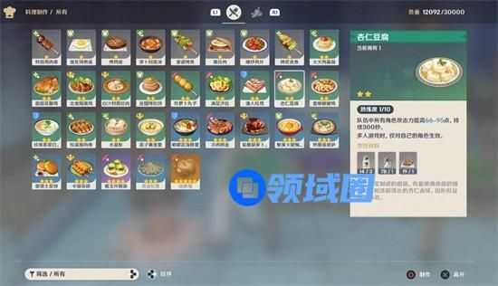 第二个需要的杏仁,玩家可以在野外自己采摘,也可以前往料理商店里购买。第三个是糖,数量为一份,需要我们打开地图寻找到猎鹿人商店的所在处购买。在战斗过程中,玩家可以食用杏仁豆腐,可让所有角色增加四十四点的攻击值,持续时间为五分钟。