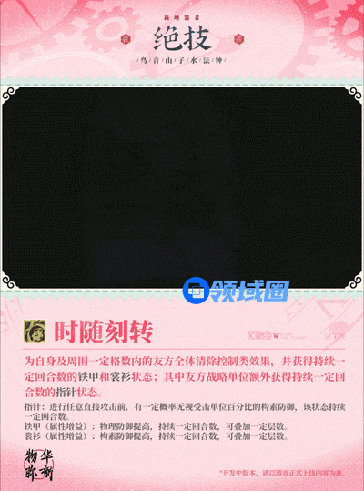 为自身及周围一定格数内的友方全体清除控制类效果,并获得持续一定回合数的铁甲和裳衫状态;其中友方战略单位额外获得持续一定回合数的指针状态。
