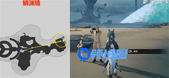 2、我选的是【鳞渊境】,所以在【鳞渊境】下图海边位置找到了这2个人,选择【旁听】对话后,即可获得该成就;