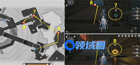 4、接着传送-3层,从下图6位置飞过去,去里面7开关位置,如果你7位置这里的桥能上去,就直接去上面8开关位置,否则就用7开关将桥放下来后上去,到上面8开关位置,再将桥升上来后,继续往上走;