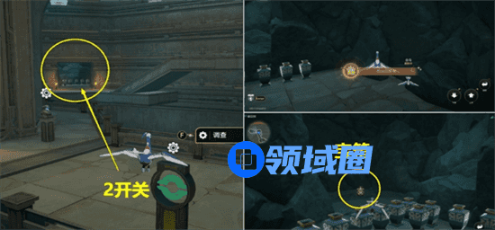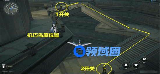 3、接着返回机巧鸟原位置,看你1机关到2机关的路是不是通的,如果跟我的不一样,那就先去调查一下1机关后就会跟我的一样,然后操作机巧鸟去下面将2机关调查一下;
