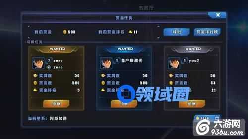 在赏金任务界面的上部显示着我的赏金及我的赏金排名信息。页面中心是当前展示的三个被通缉赏金对象。