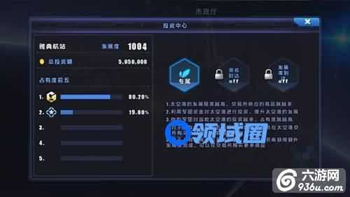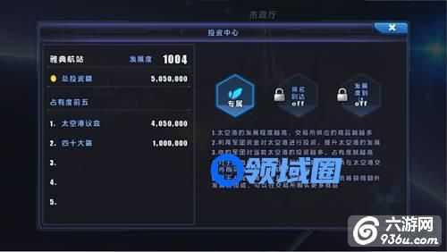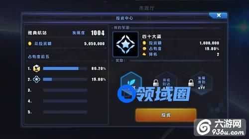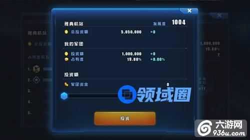 投资界面中,你将了解到当前太空港的发展情况及本军团的投资情况。选择了合适的投资金额之后,点击投资按钮即可完成投资了。