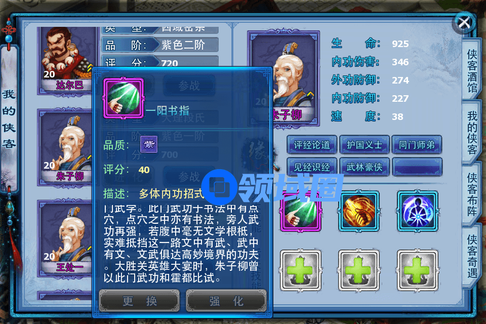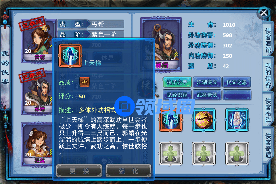 蓝色大众技能,蓝色侠客4种性格简历(侠客缘)和蓝色大众门派技能。如郭靖(上天梯 ps:此人爬的一手好梯)此为一流侠客,如图: