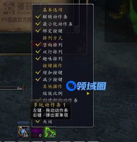 多玩动作条 键位不够用时或者有一些常用的加状态的物品可以放上面,此动作条左上角右键有菜单,可自行选择