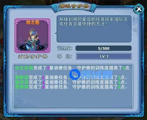 2.守护兽有自己的等级,该等级可以通过完成帮派驯兽任务获得训练度来提高,等级提升后,守护兽的造型和名称会相应改变,帮派内的NPC造型也会改变。